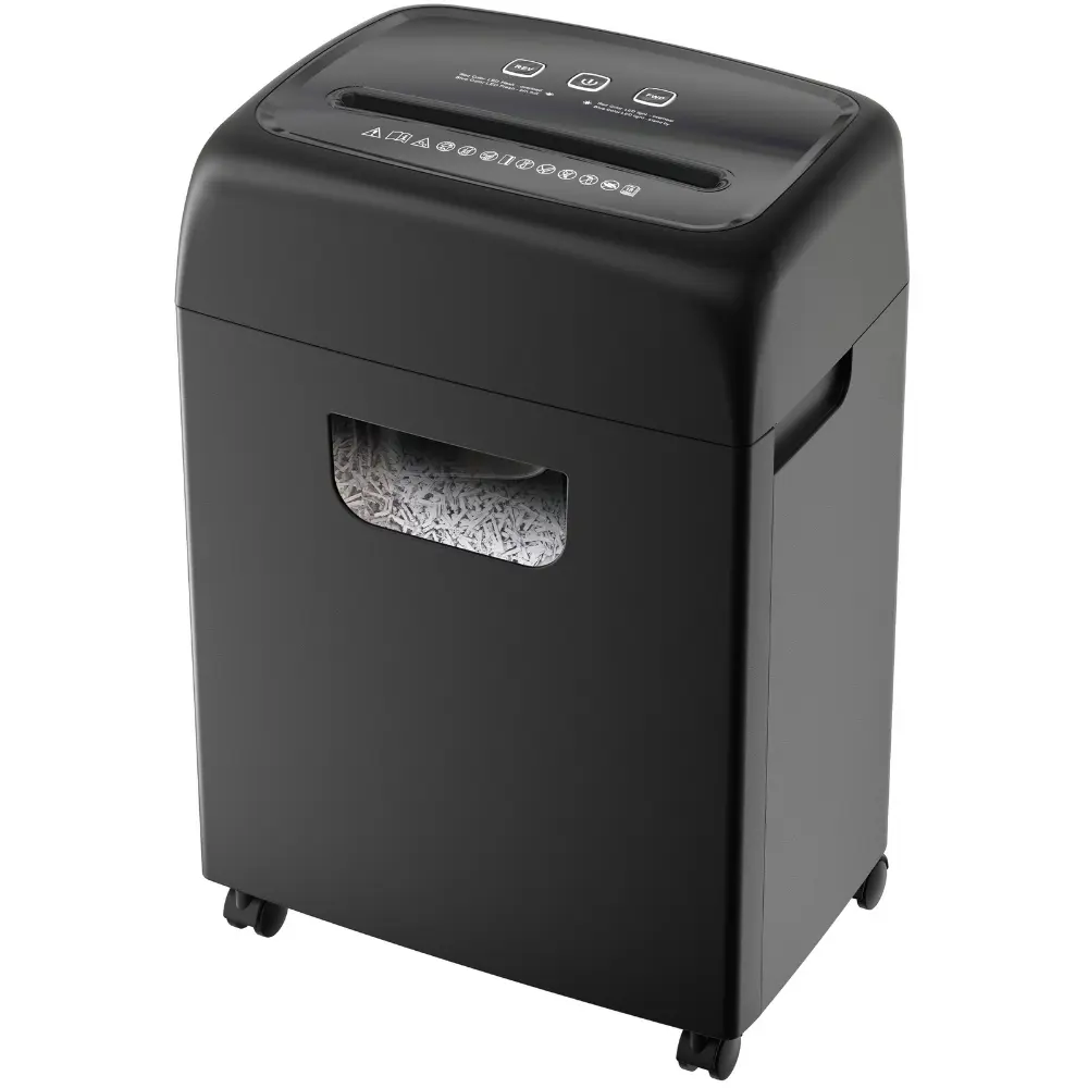 Shreds paper into 4x33mm pieces for secure disposal.